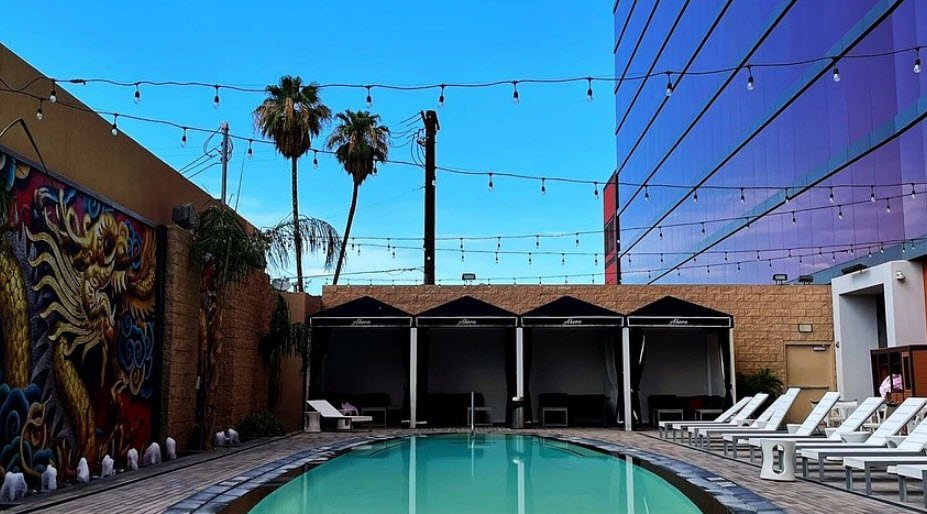 It now emphasizes upscale hospitality with four restaurants featuring star chefs, an outdoor pool, event spaces for up to 680 guests, and proximity to attractions like the Stratosphere, catering to business travelers and small groups without gaming.