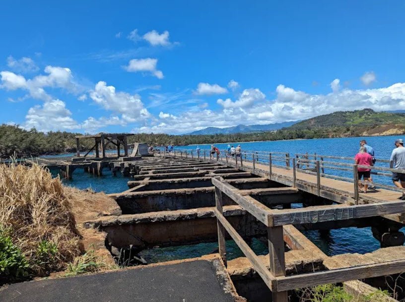 Ahukini Recreational Pier State Park is a small coastal park at the mouth of Hanamaʻulu Stream on Kauaʻi island in Hawaii, USA, featuring a concrete pier with a wooden walkway extending over rocky shores into the Pacific Ocean.