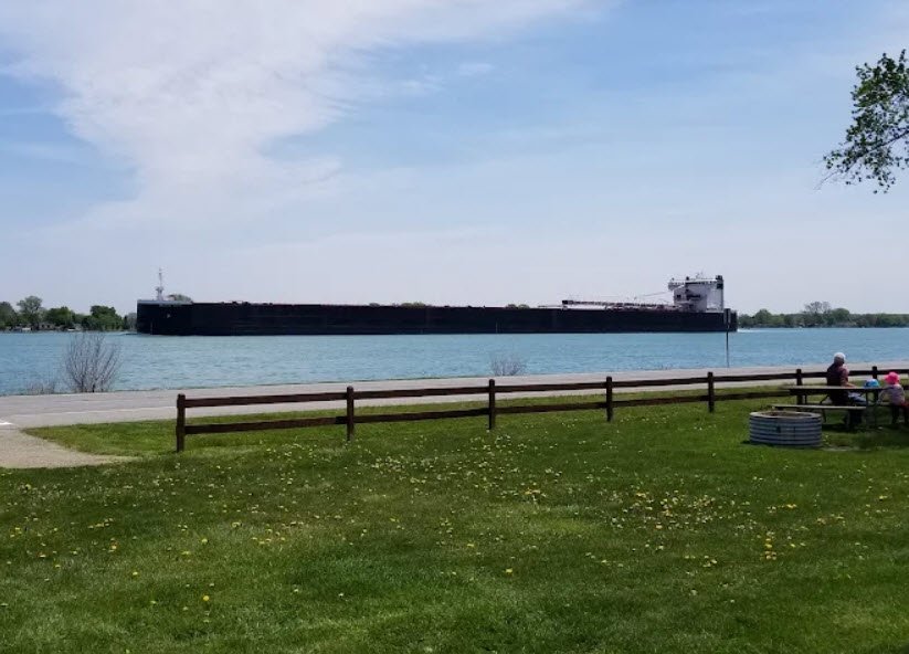 Algonac State Park spans 1,550 acres along the St. Clair River north of Algonac in St. Clair County, Michigan, offering prime views of massive international freighters passing by its half-mile riverfront.