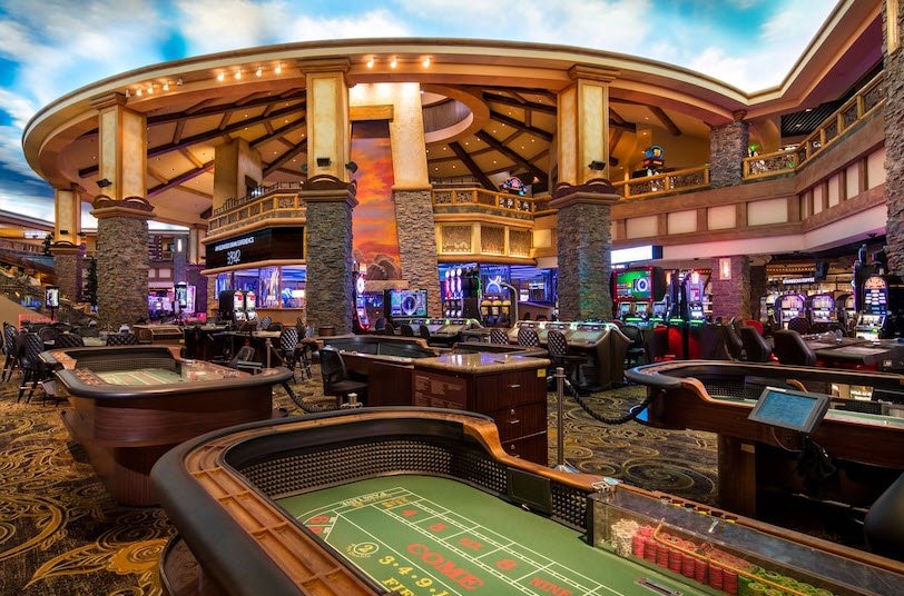 The two-story casino spans over 57,000 square feet with 940 slot and video poker machines, 40 table games including blackjack and craps, 22 live poker tables, and a high-limit salon, all designed with rustic elegance via timber beams, stone fireplaces, and soaring skylights.