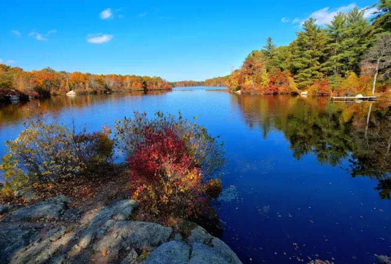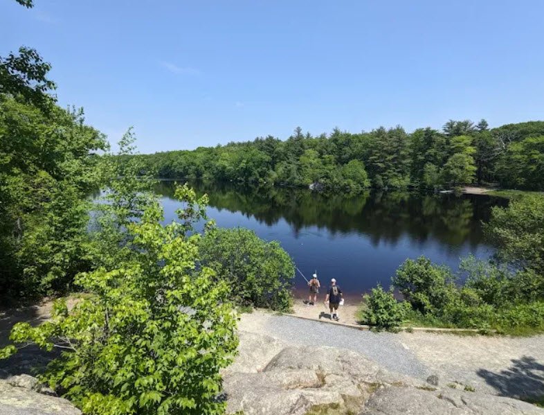 Ames Nowell State Park covers about 700 acres in Abington, Massachusetts, featuring Cleveland Pond as its centerpiece for non-motorized boating, fishing stocked with bass and pickerel, and scenic shoreline trails. The park preserves colonial-era stone walls, wagon bridges, and quarries from the 1600s-1700s, once home to mills on Beaver Brook and later a private bird sanctuary before state acquisition. Over 10 miles of easy-to-moderate paths wind through forests and wetlands for hiking, mountain biking, horseback riding, cross-country skiing, picnicking, and ball fields, offering a quiet suburban retreat year-round.