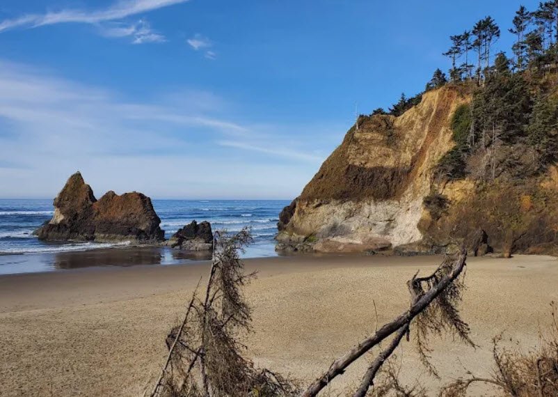 Managed by the Oregon Parks and Recreation Department since land acquisitions from 1971 to 1985, it offers free year-round access with picnic tables, pit toilets, ample parking, and short trails to tide pools teeming with sea anemones, crabs, and starfish at the north near Humbug Point with Lion Rock offshore and south toward Hug Point—both passable only at low tide.
