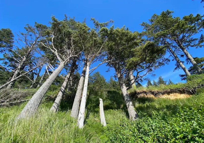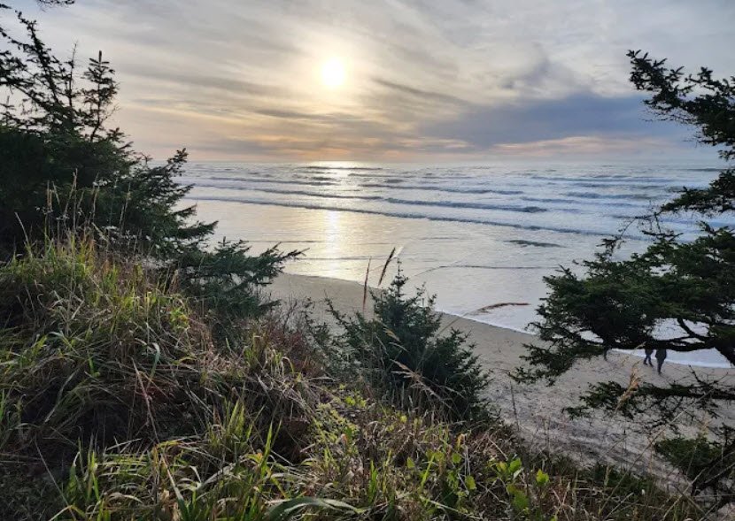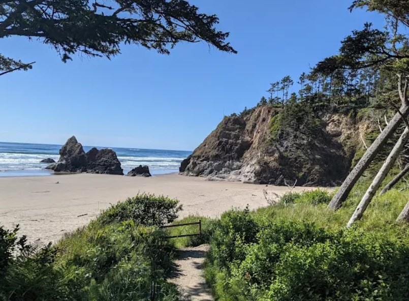 Arcadia Beach State Recreation Site is a picturesque day-use state park in Clatsop County, Oregon, USA, located about two miles south of Cannon Beach along U.S. Highway 101, featuring a mile-long sandy beach framed by shady shore pine groves, rocky headlands, and dramatic ocean views.