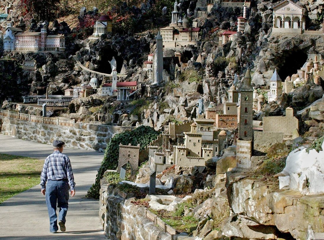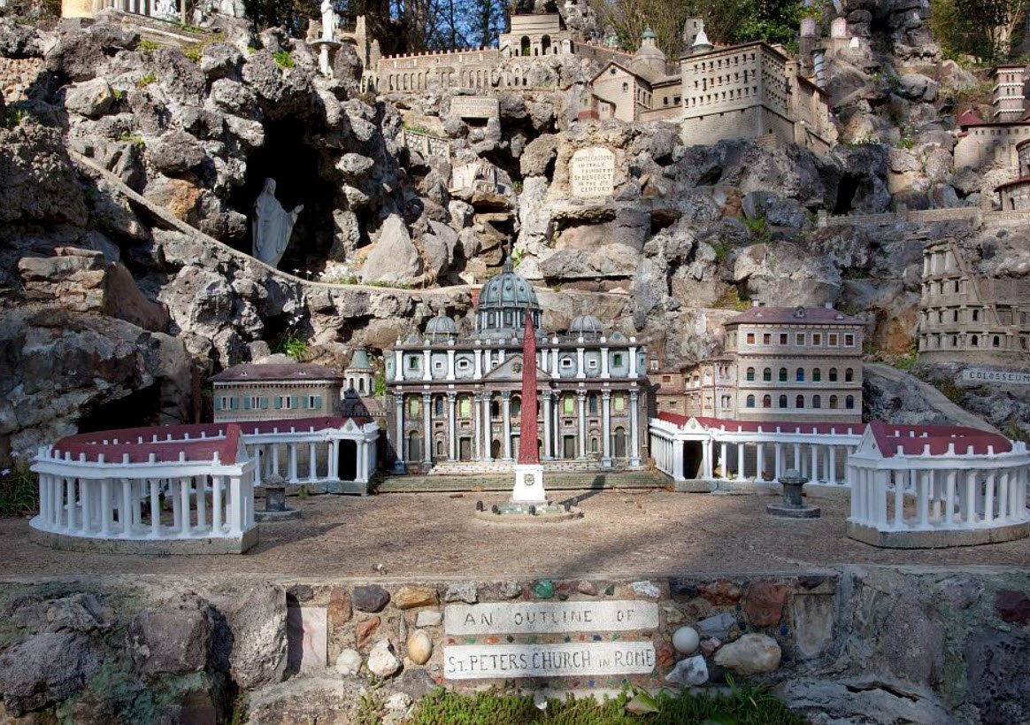 Over nearly 50 years, from 1932 to 1961, Brother Joseph built 125 detailed miniature replicas of famous religious structures, historical landmarks, and biblical scenes using concrete, stone, and discarded materials like marbles, tiles, seashells, and costume jewelry. The park is located in a former quarry and features replicas ranging from St. Peter's Basilica to the Tower of Babel, along with scenes from the Holy Land.