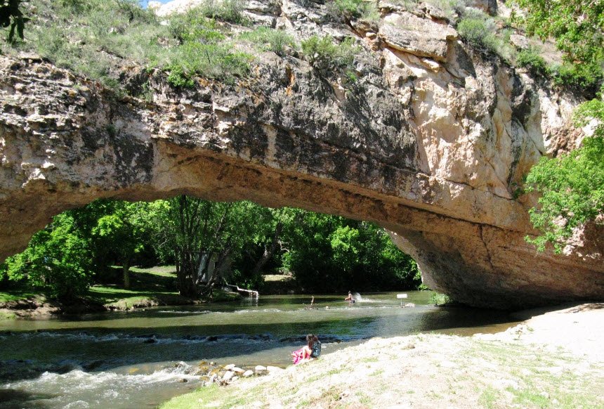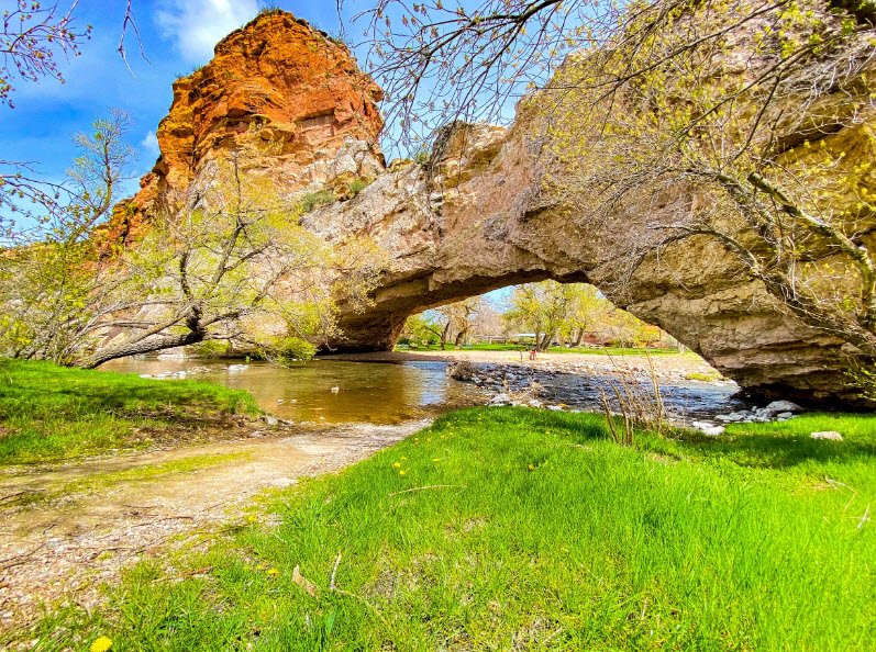 Ayres Natural Bridge Park in Converse County, Wyoming, is a scenic natural wonder nestled in a red-rock canyon about 10 miles west of Douglas and just south of the historic Oregon Trail.