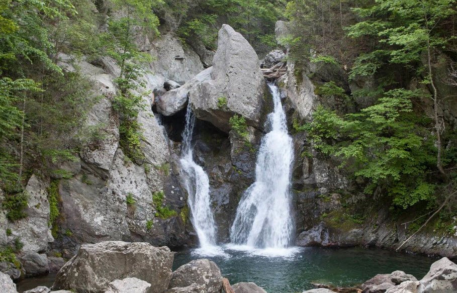 Bash Bish Falls in southwestern Massachusetts is the highest waterfall in the state, plunging about 60 feet in a dramatic "V" shape formed by twin cascades that drop over rugged rocks into a serene pool below.