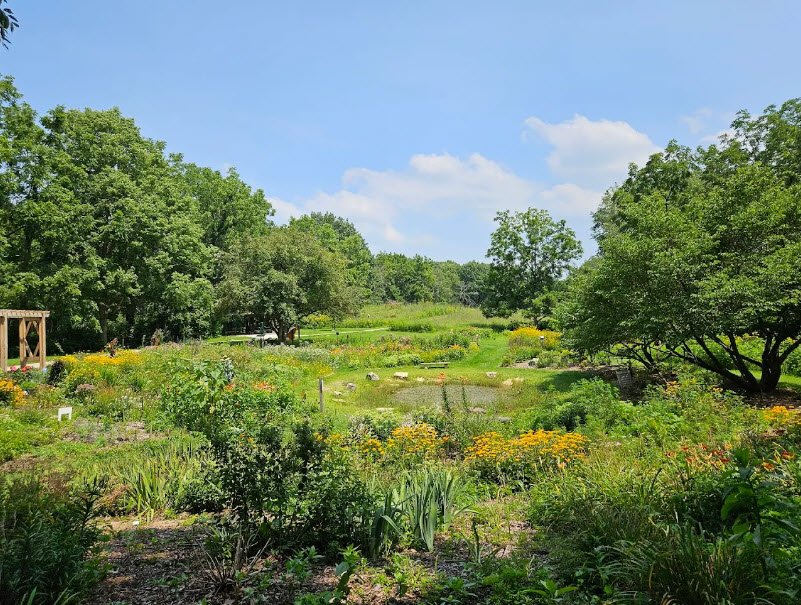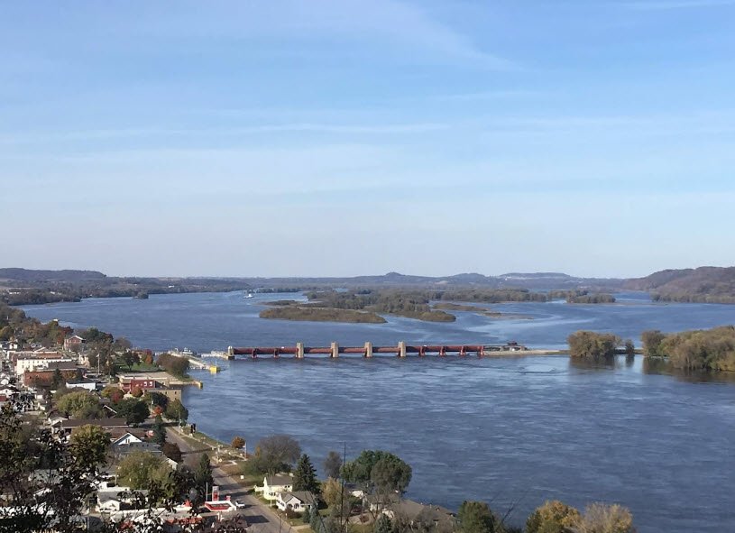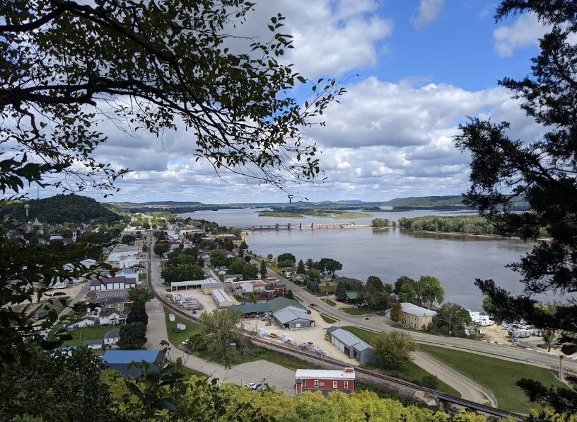 Bellevue State Park's Nelson Unit sits atop a 300-foot limestone bluff on the Mississippi River's western edge near Bellevue, Iowa, USA, offering stunning panoramic views, hiking trails to Pulpit Rock and ancient Indian burial mounds from 500 B.C. to A.D. 1200, and a vibrant Butterfly Garden attracting nearly 60 butterfly species amid perennial flowers and a frog pond.
