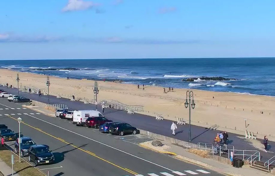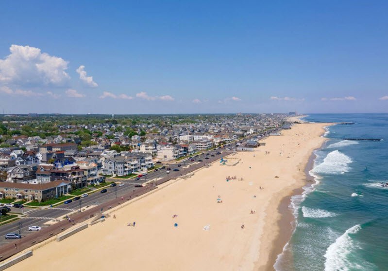 Belmar Beach in New Jersey is a popular, well-maintained public beach known for its clean, spacious sandy shores and a one-mile-long boardwalk that offers picturesque views of the Atlantic Ocean.
