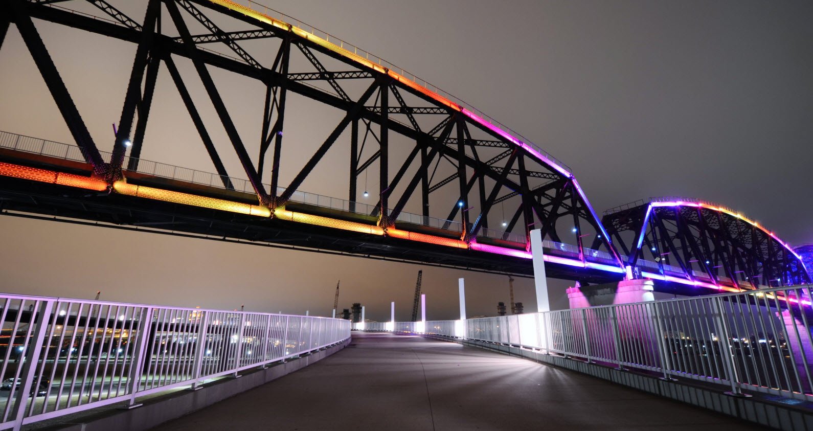 Today, it is a popular urban attraction enjoying millions of visitors annually, featuring scenic views of the river and city, illuminated at night with colorful lighting, and providing a key recreational link between Louisville and Jeffersonville.