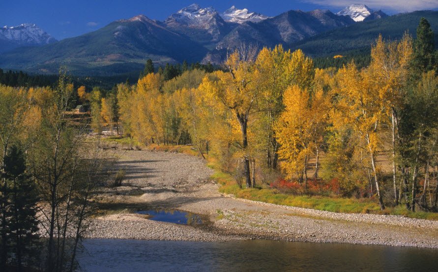 The Bitterroot River in Montana flows northward for about 84 miles through the Bitterroot Valley before joining the Clark Fork River near Missoula.