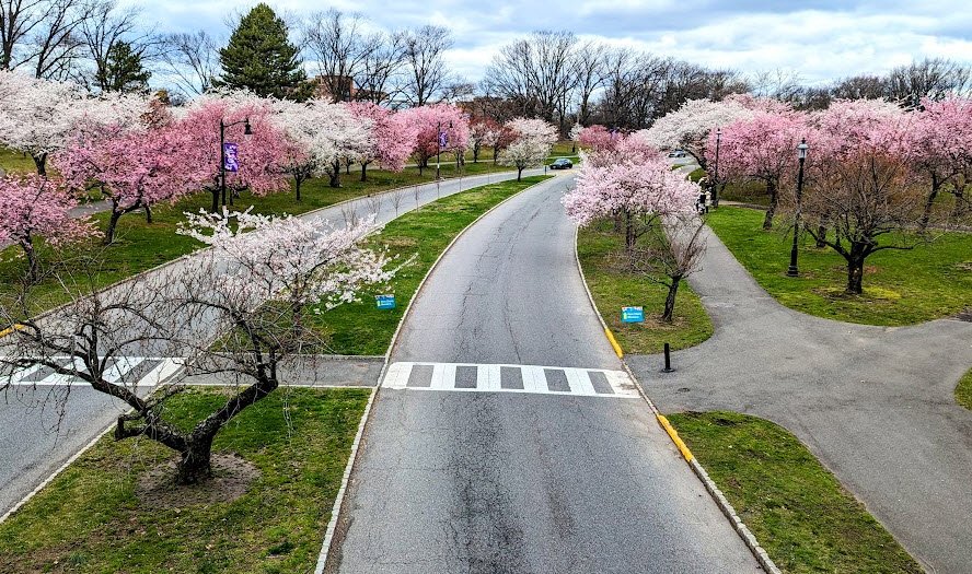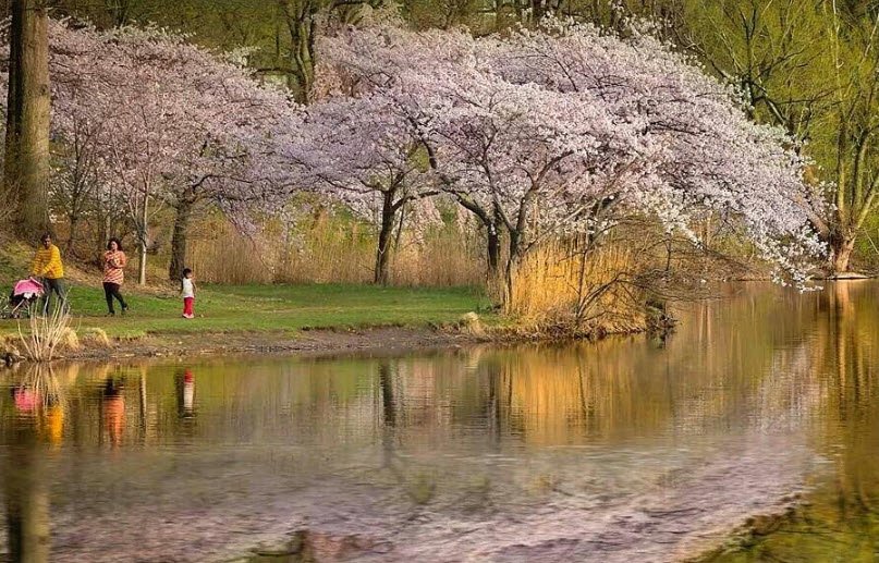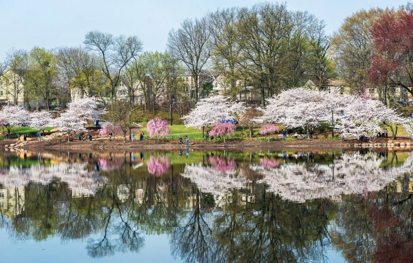 Designed initially by John Bogart and Nathan Barrett and later refined by the Olmsted Brothers, the park features a unique blend of gardenesque elements, naturalistic landscapes, numerous bridges, gazebos, and arbors alongside geometrically patterned gardens. It is renowned for its extensive collection of more than 4,000 cherry blossom trees planted in 1927, which draw large crowds each spring for the celebrated Cherry Blossom Festival.