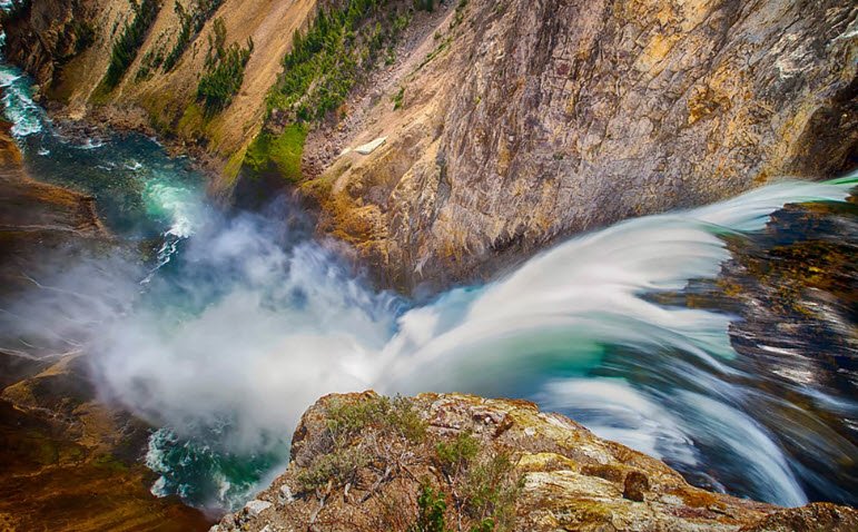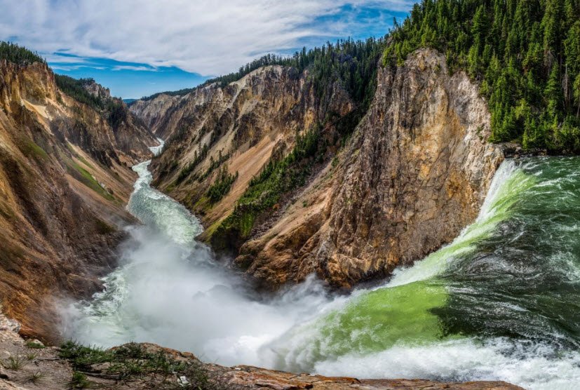 The Brink of Lower Falls in Yellowstone National Park, Wyoming, is a popular viewpoint offering a dramatic close-up view of the 308-foot Lower Yellowstone Falls—the tallest waterfall in the park.