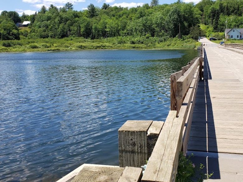 The Brookfield Floating Bridge, also known as the Sunset Lake Floating Bridge, spans Vermont Route 65 across Sunset Lake in Brookfield, Vermont.