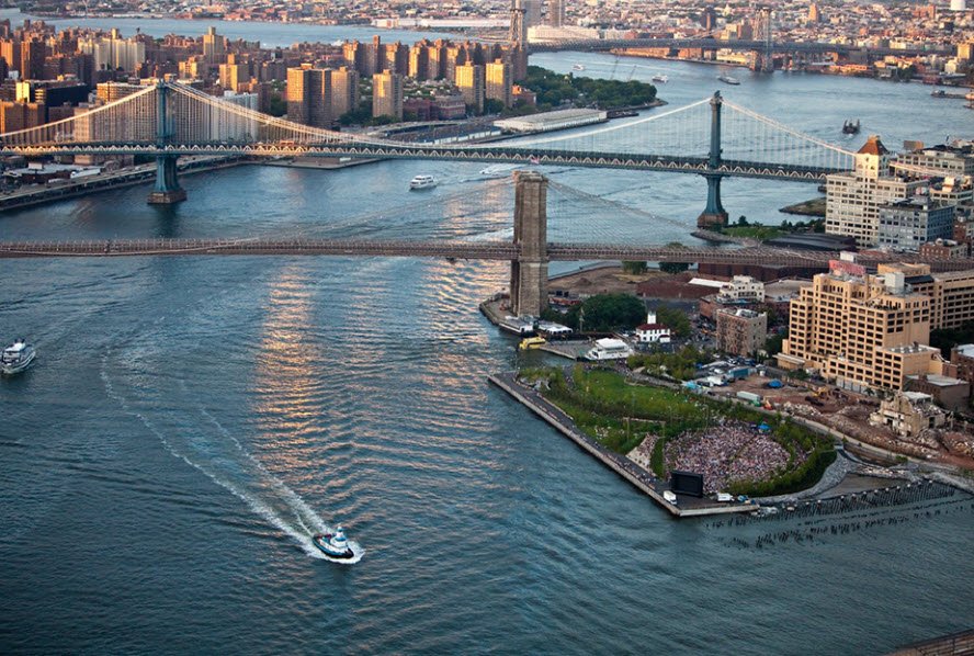 Originally a bustling 17th-19th century trade hub with Fulton Ferry service since 1814, finger piers, and Empire Stores warehouses that declined after Brooklyn Bridge opening in 1883 and BQE construction in 1954, the site hosted cargo until the 1970s before reclamation efforts led to a 2002 state-city agreement.