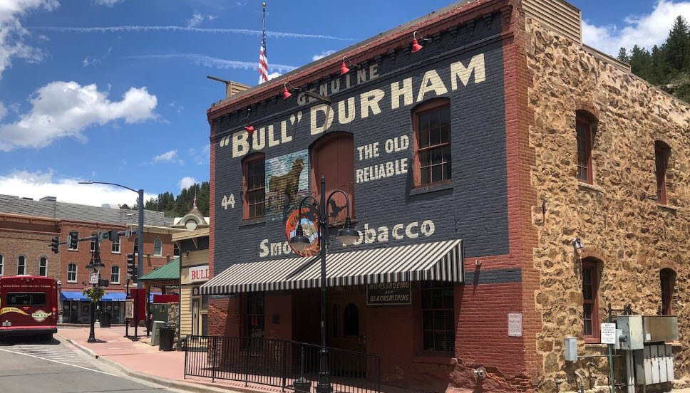 Bull Durham Casino is a historic, slots-only gaming spot in Black Hawk, Colorado, opened in February 1993 inside a landmark 19th-century building originally used as a wagon works, livery stable, blacksmith shop, art studio, and store, named after a prominent 1912 tobacco ad painted on its exterior.