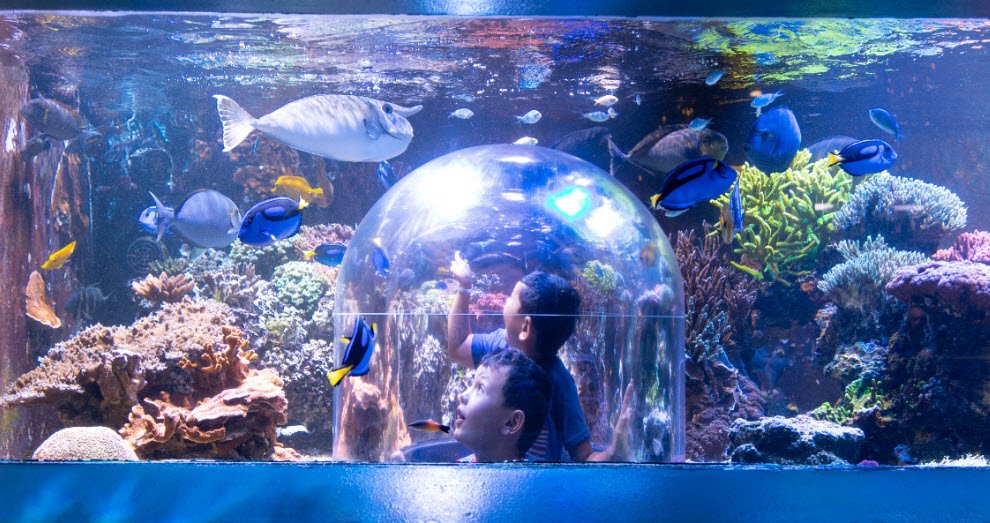 Visitors can experience a tropical conservatory housing over 800 free-flying butterflies from around the world among lush plants, waterfalls, and a koi pond. The aquarium features vibrant marine life including colorful fish, corals, jellyfish, and interactive touch pools with stingrays and starfish. The facility emphasizes education and conservation, offering hands-on learning experiences while inspiring visitors to appreciate and protect wild species and their habitats.