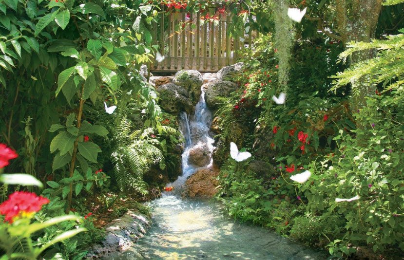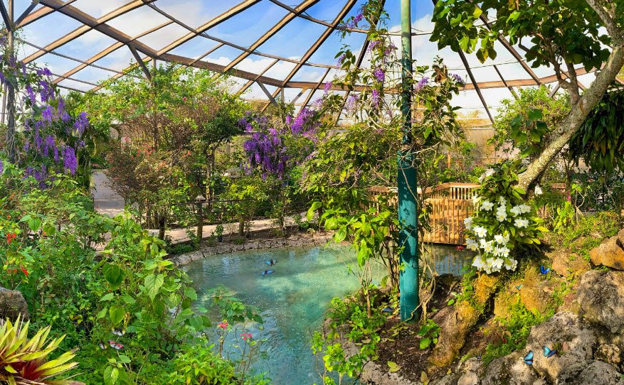 It features six large aviaries, including the Paradise Adventure Aviary and the Tropical Rain Forest Aviary, where visitors can walk among free-flying butterflies in lush, tropical settings complete with waterfalls and flowering plants.