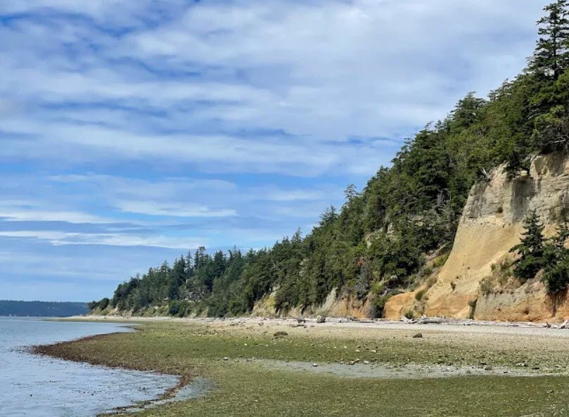 Camano Island State Park spans 173 acres on Camano Island in Washington's Puget Sound, about 14 miles southwest of Stanwood, featuring 6,700 feet of rocky shoreline ideal for outdoor escapes.
