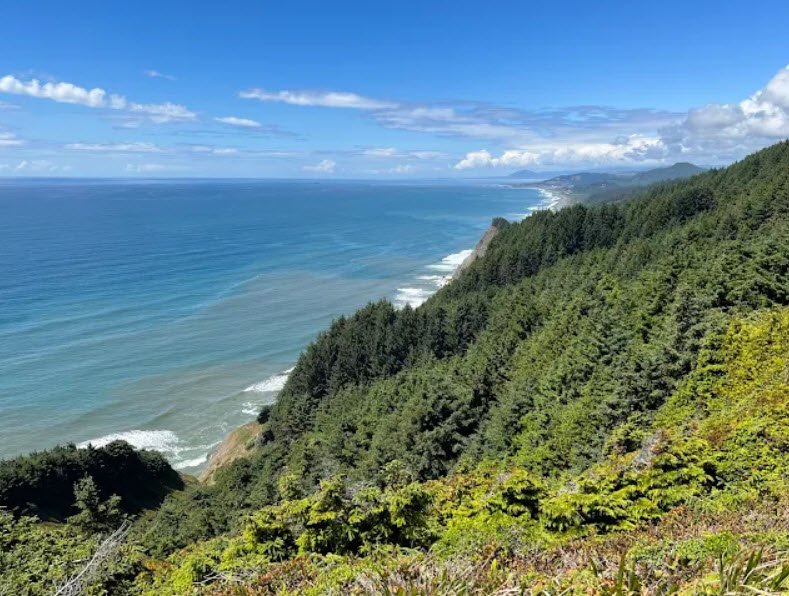 A Sitka spruce forest covers the area, where visitors enjoy a moderate 3.3-mile Cape Sebastian Trail descending to lower cape levels for whale watching during gray whale migrations, hiking, tidepooling, and wildlife observation.