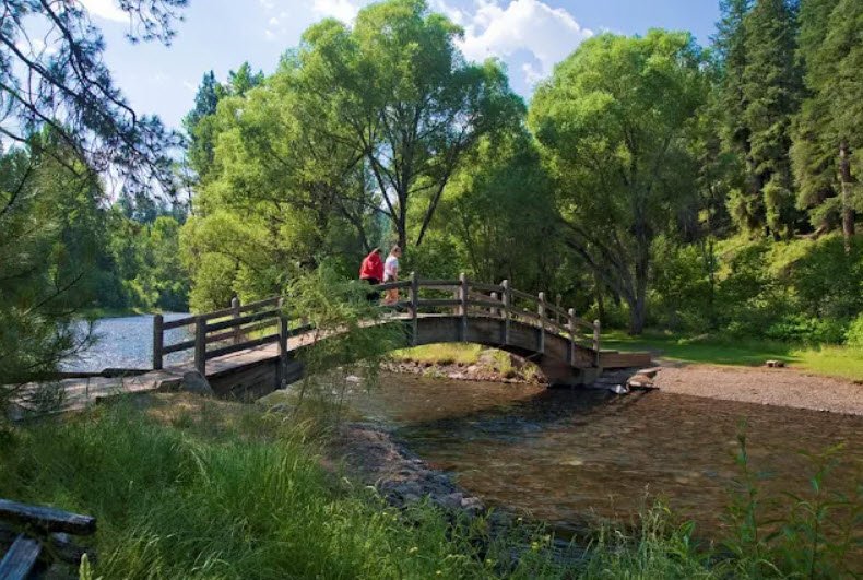 It offers 20 primitive first-come, first-served campsites accommodating tents and small RVs with flush toilets, firewood sales, reservable picnic areas, horseshoe pits, and easy trails like the 0.75-mile Salmon Run Trail and 1.5-mile North Ridge Loop for peaceful hikes amid wildlife and mountain views.