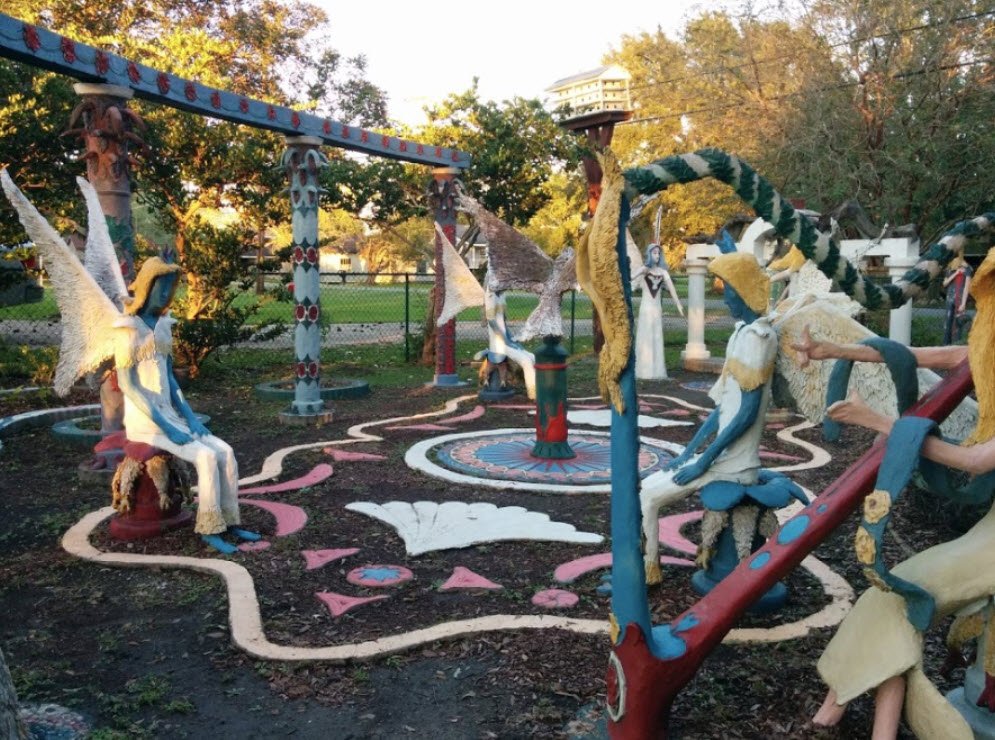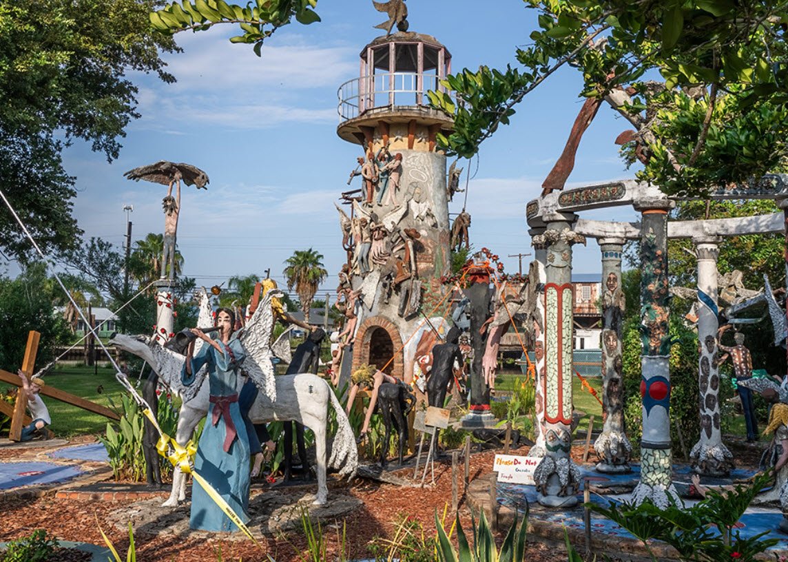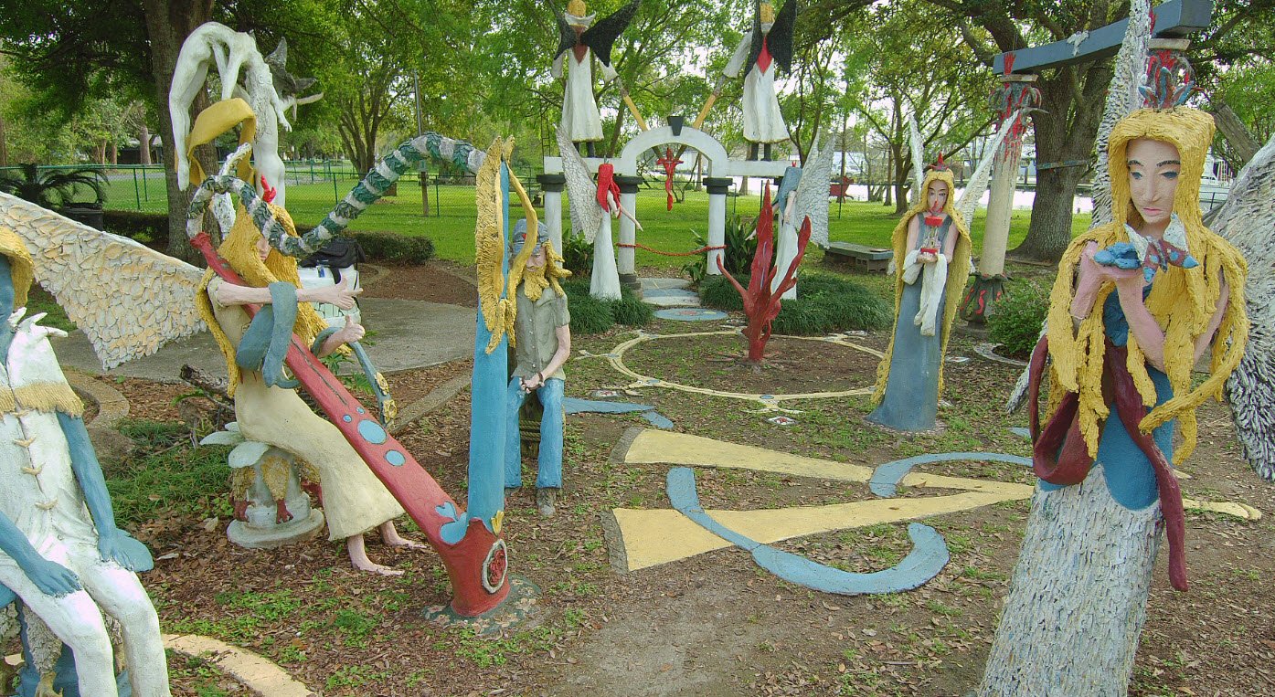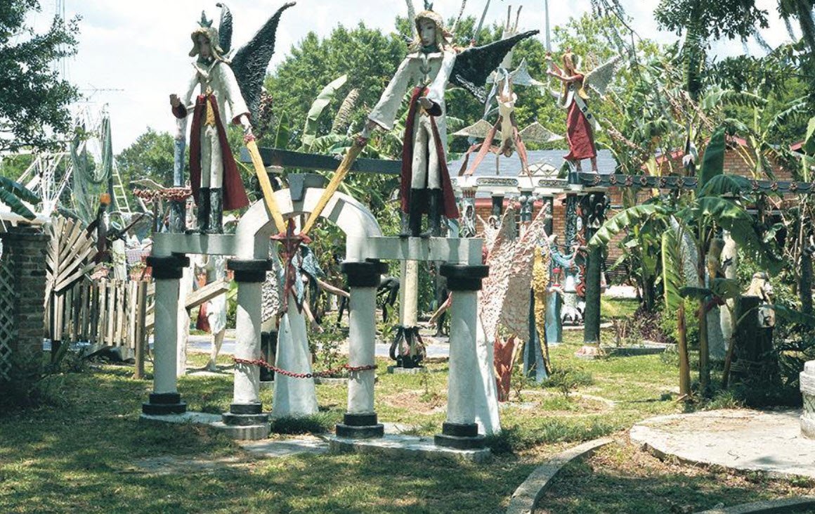 Located in the small fishing community of Chauvin along Bayou Petit Caillou, the garden features nearly 100 life-sized concrete and brick sculptures including angels, soldiers, cowboys, and figures of personal and religious significance, which together form a deeply autobiographical and symbolic landscape.