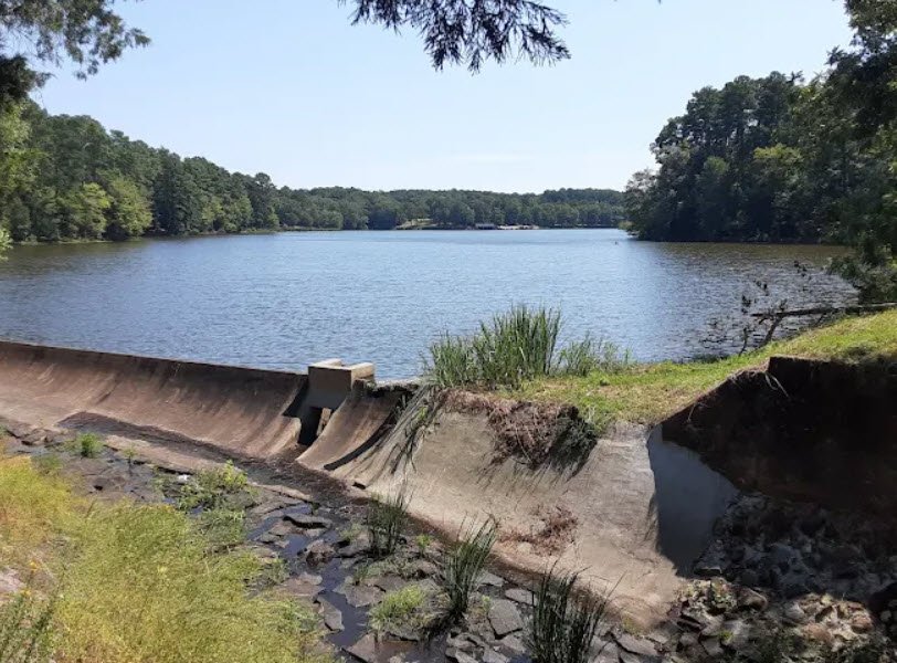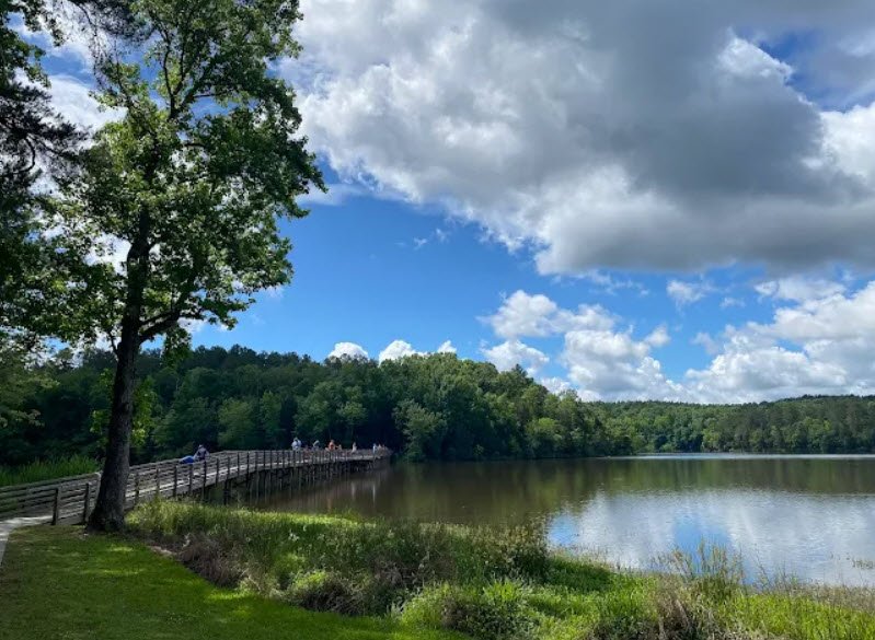 It features a 472-foot fishing pier and walking bridge across the lake, a two-mile nature trail to a stone spillway, jon boat and canoe rentals, a public boat ramp for electric motors, picnic shelters, playgrounds, and Lakeview Hall for events.