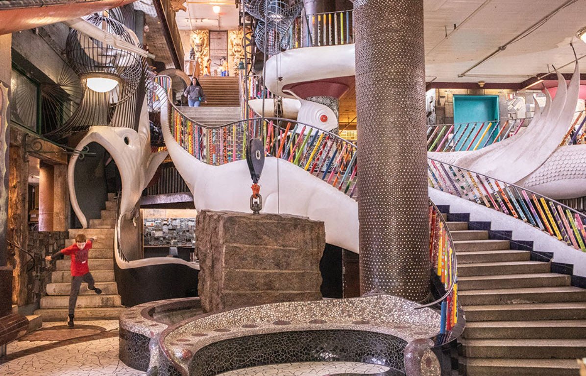 It offers an expansive playground with tunnels, caves, over 30 slides, and climbing structures that span multiple floors, including a giant whale and a hollowed-out tree. The museum also includes a circus, an aquarium, an art gallery, and outdoor spaces with eclectic attractions like a Ferris wheel and a school bus perched on the roof.