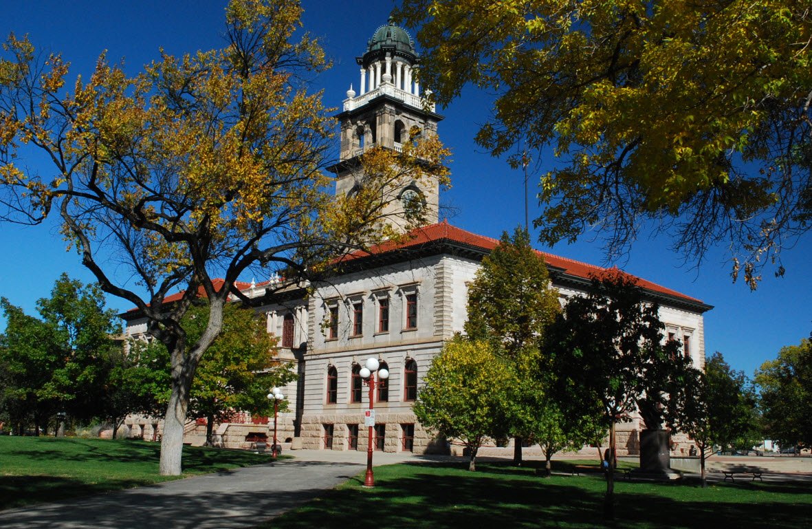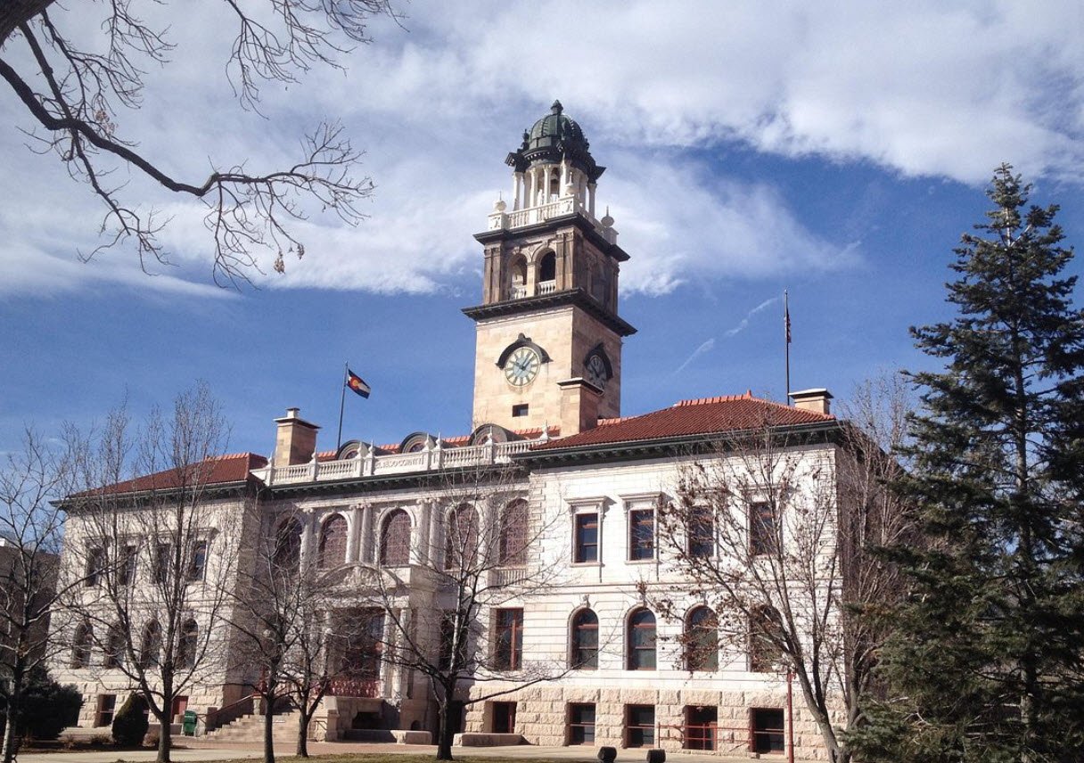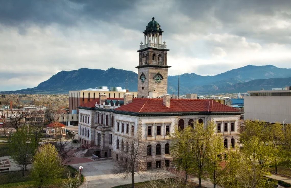 The Colorado Springs Pioneers Museum is housed in the historic 1903 El Paso County Courthouse building, featuring a distinctive granite facade and domed clock tower.
