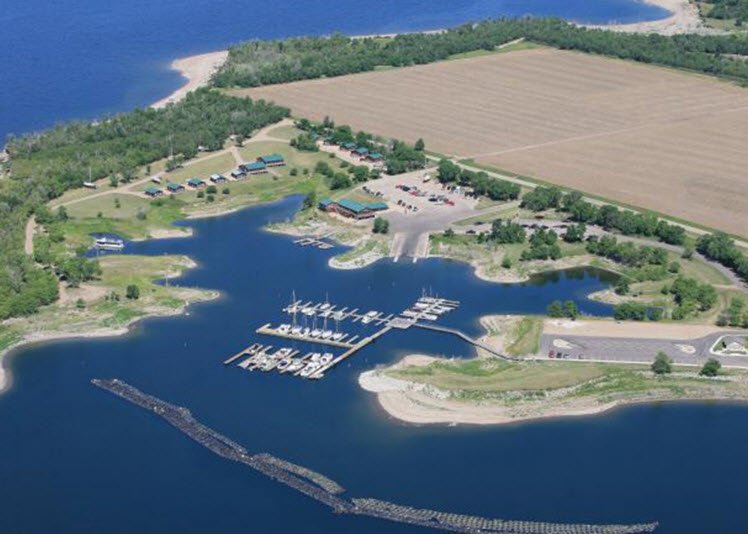 Water enthusiasts enjoy boating, canoeing, kayaking, paddleboarding, sailing, water skiing, and diving on the expansive lake teeming with walleye, while birdwatching, biking on park roads, walking, and hunting nearby draw campers to this rugged area explored by Lewis and Clark.