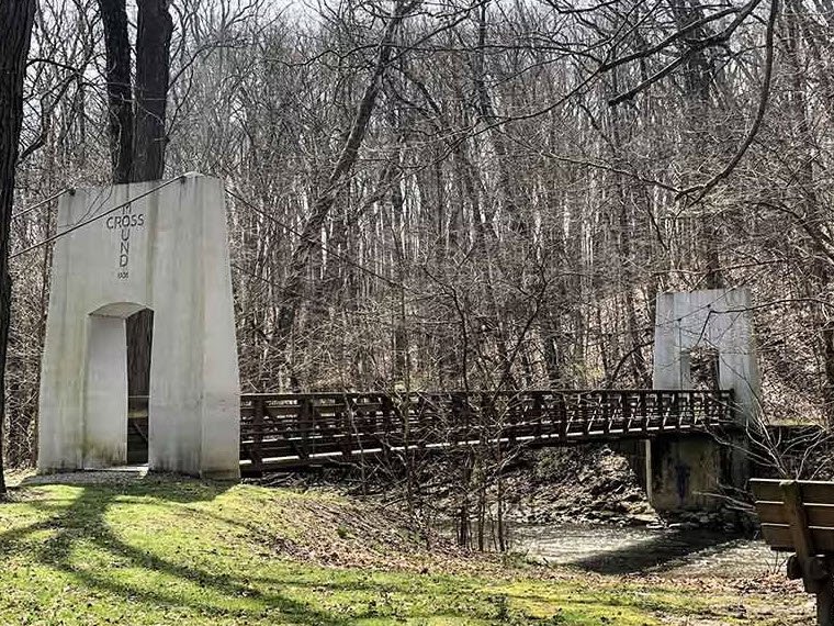 Cross Mound Park, a 28+ acre site in Clearcreek Township, Fairfield County near Tarlton, Ohio, centers on a rare prehistoric earthwork shaped like a plus-sign cross with four identical arms each 12 feet wide, 3 feet high, and 45 feet long, aligned nearly to cardinal directions and featuring a central 20-foot circular depression.