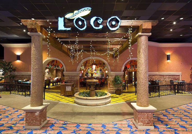 It features a 102-room modern hotel with amenities like a fitness center, indoor pool, multiple restaurants including Mr. Lester's Steakhouse, Loco Mexican Grill, Mabel's Kitchen, and Cafe Delphine, live entertainment at ROX nightclub, conference facilities, free Wi-Fi, parking, and shuttle service.