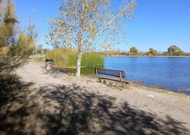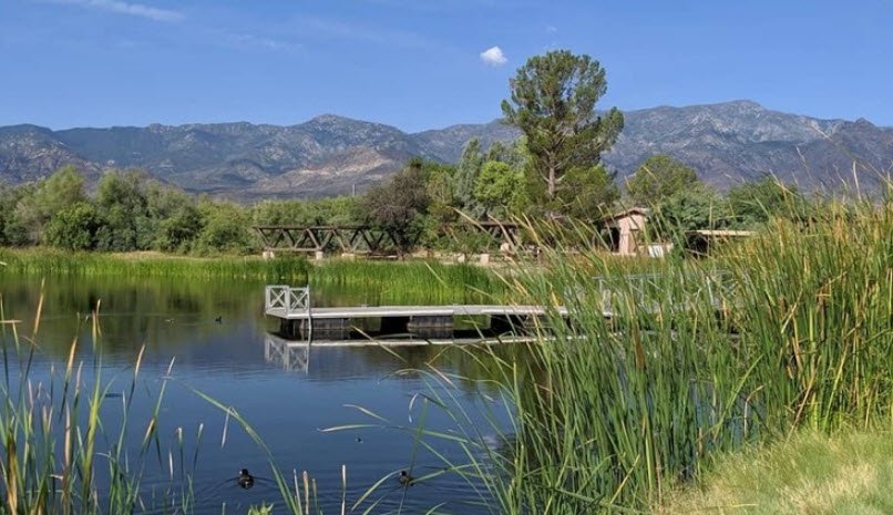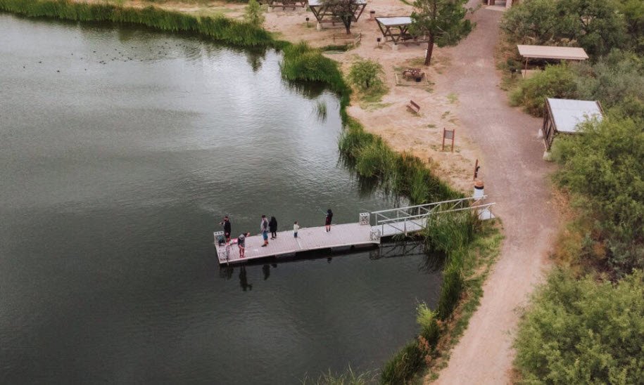 Popular for shore fishing largemouth bass feasting on stocked rainbow trout, kayaking, and picnicking with tables, grills, restrooms, and a playground, it features the easy 1.4-mile Dankworth Pond Trail loop and 1.75-mile Dos Arroyos Trail to a recreated ancient Indian village with dwelling replicas, grinding stones, and roasting pits illustrating southwestern tribal life.