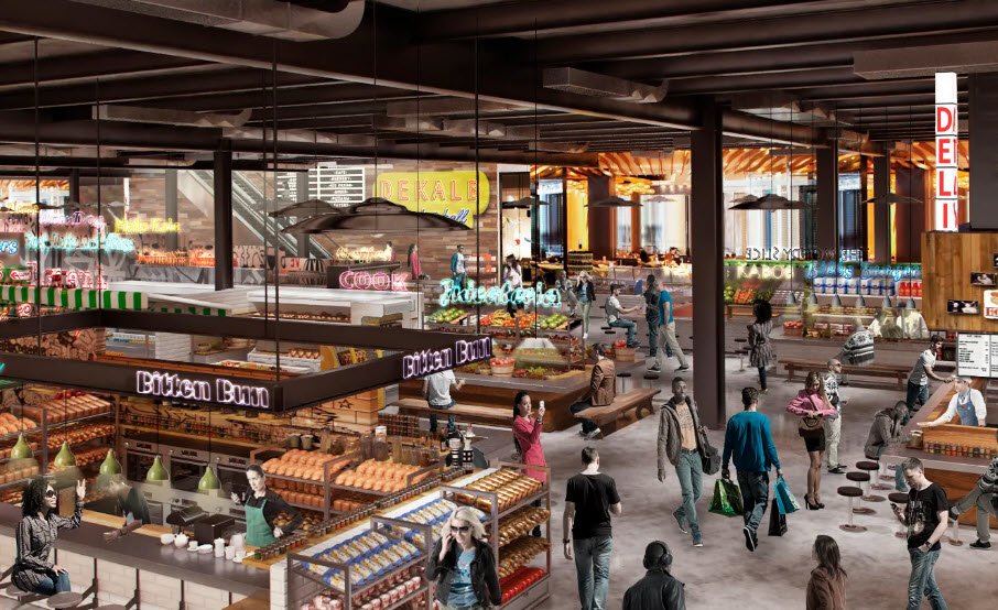 DeKalb Market Hall, located in the City Point development at 445 Albee Square West in downtown Brooklyn, is one of the largest food halls in the country, covering 60,000 square feet.
