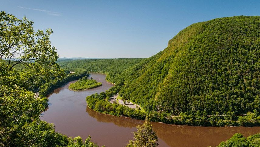 Delaware Water Gap in New Jersey is a dramatic water gap where the Delaware River cuts through the Kittatinny Mountain ridge in the Appalachian Mountains, forming a 1,300-foot-wide canyon over 1,200 feet deep between Mount Tammany on the New Jersey side and Mount Minsi in Pennsylvania.