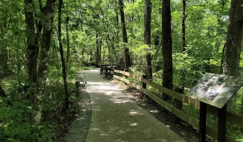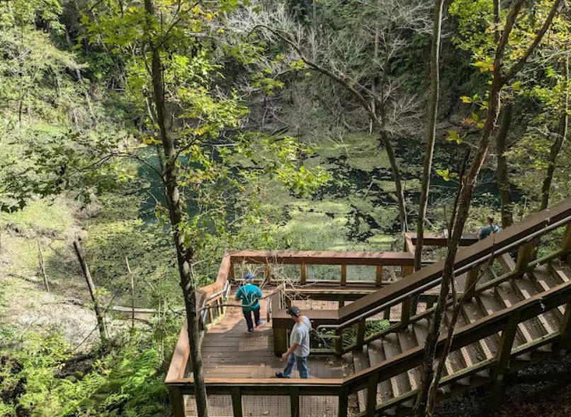 Visitors descend 132 steps on a boardwalk into the shaded, cooler sinkhole for geological study including fossils like shark teeth, then hike 1.25 miles of pine sandhill trails, picnic, and explore exhibits at the interpretive center in this 71-acre haven open daily from 8 a.m. to sunset.