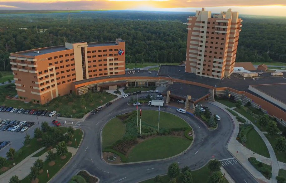 The expansive property boasts over 70,000 square feet of gaming with 2,000+ slot machines, 44 table games including poker, a spa, 374 rooms across two towers, multiple restaurants, a convention center, 36-hole golf course at Loma Linda Country Club, outdoor concert venue for 7,500, and a 2014 Kansas expansion adding 162 machines, cigar lounge, and nightclub.