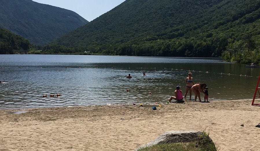 Echo Lake Beach in Franconia Notch State Park near Franconia, New Hampshire, is a serene 39-acre spring-fed freshwater lake at 1,931 feet elevation with a sandy beach framed by dramatic views of Cannon Mountain and the Franconia Ridge.