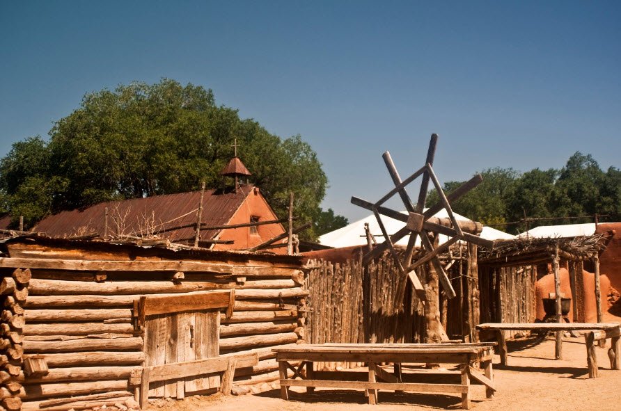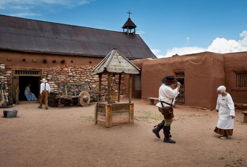 Originally a paraje or rest stop dating to the early 1700s with original adobe buildings and acequias on the National Register of Historic Places, it was purchased in 1932 by Leonora Curtin and transformed by her and husband Y.A. Paloheimo into an immersive site featuring restored haciendas, a water mill, blacksmith shop, church, general store, and mountain village where costumed interpreters demonstrate weaving, milling, hide tanning, and crop planting.