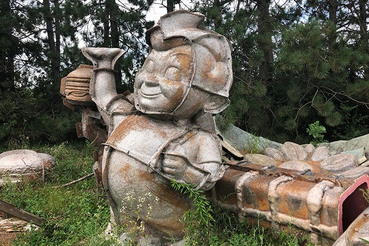 These molds represent a wide variety of creations made since the company's founding in 1983, including giant animals, oversized characters like Yogi Bear and Big Boy, massive slides, and other whimsical shapes. Over time, exposure to the elements has weathered the molds, giving them a stone-like, almost ancient appearance, creating an eerie yet fascinating atmosphere.