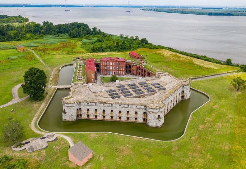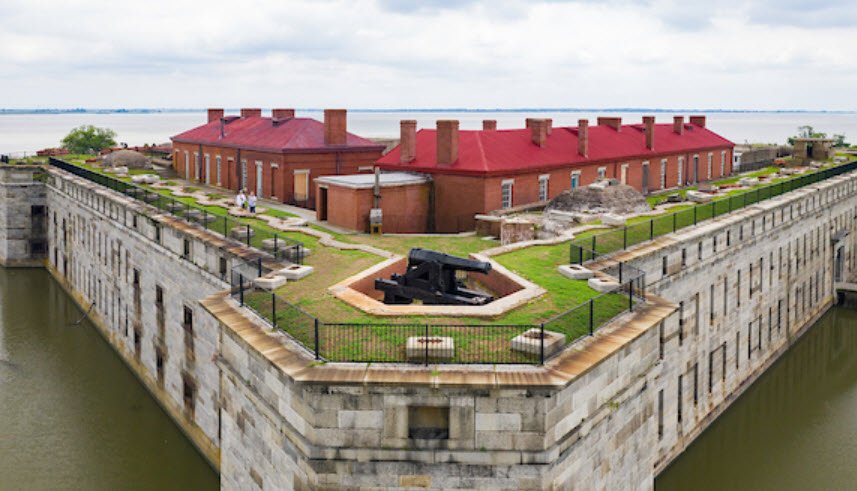 The fort features an irregular pentagon design with multiple tiers of cannon and a moat, reflecting its military significance. Today, the park offers visitors a historical experience with costumed interpreters, reenactments, and live demonstrations, accessible by ferry from Delaware City.