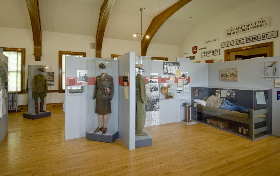 The museum showcases over 75 years of military history, beginning with the fort's establishment in 1874 to guard the Red Cloud Agency during the Indian Wars. It details significant events such as the surrender and death of Sioux leader Crazy Horse, the harsh conditions leading up to the Fort Robinson Massacre involving the Northern Cheyenne, and the fort’s role in training horses, mules, and dogs for the U.S. Army, including a K-9 Corps training center during World War II.
