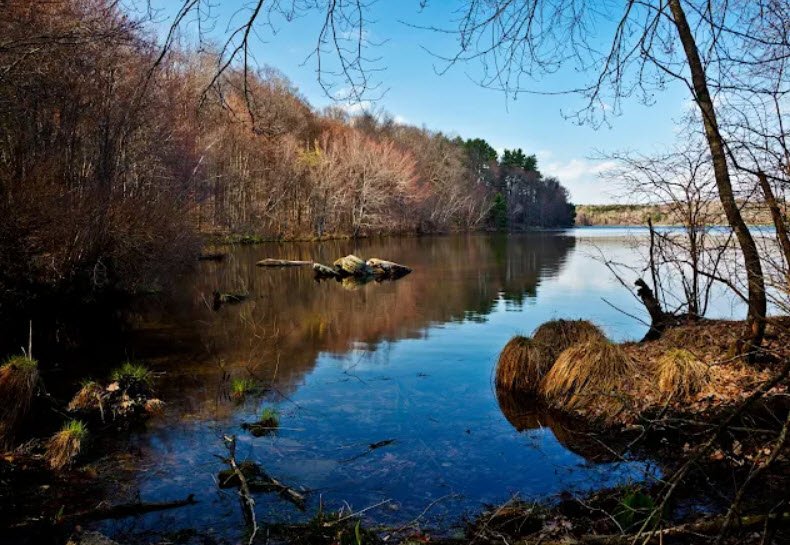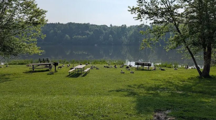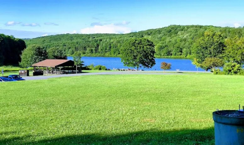 Named for a girl abducted by Native Americans in 1755 who later lived nearby, it offers boating with electric motors only, rentals for rowboats, kayaks, and paddle boats, fishing from an ADA-accessible pier for trout, bass, and panfish, plus swimming beaches.