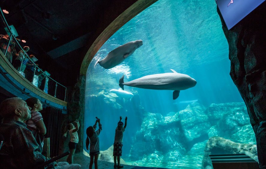 Housing over 11 million gallons of water across seven galleries, it features thousands of animals including whale sharks in the massive Ocean Voyager exhibit, beluga whales, dolphins with interactive shows, manta rays, sea lions, and sea otters amid immersive habitats like Tropical Diver and Cold Water Quest.