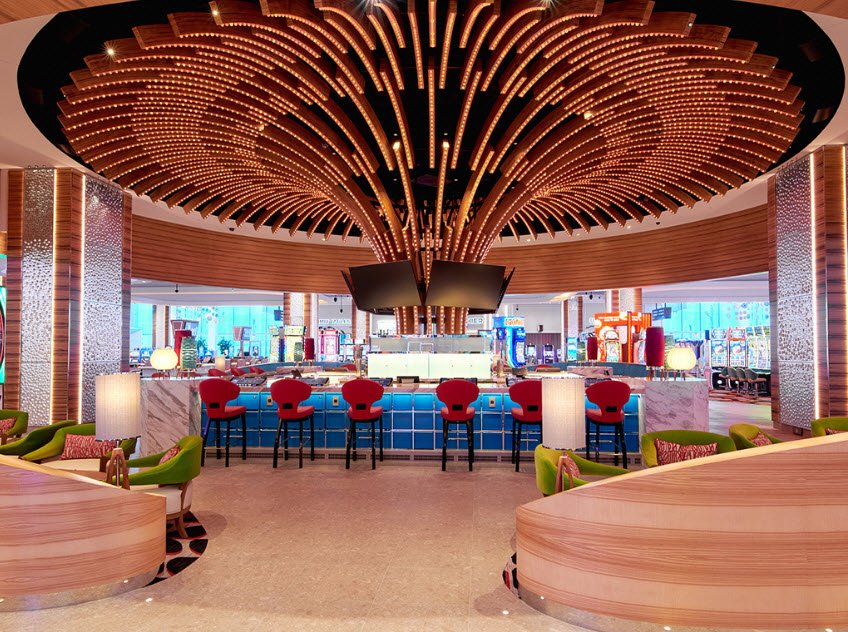The casino offers several dining options, including casual eateries like Upper Deck Deli and Mein Dish, plus the sit-down restaurant Honey & Vine with an outdoor patio and live music on weekends. The design of Santan Mountain is sleek and modern, emphasizing natural light with floor-to-ceiling windows and neutral tones.