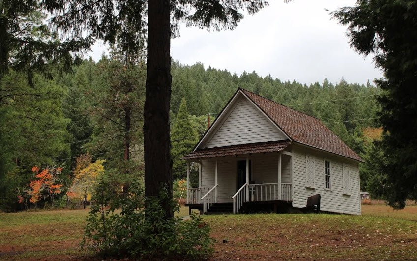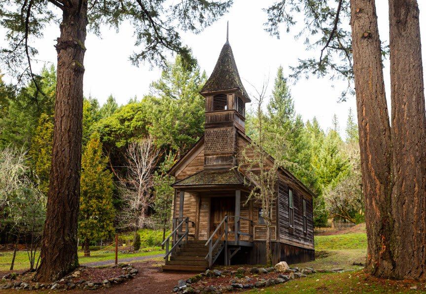 Acquired by Josephine County in 1968 and expanded by OPRD purchases through 2006, visitors can now explore four remaining structures—a church rebuilt in 1950, a former residence, a shed, and the old post office/store—perched above the historic valley, offering a free, year-round day-use glimpse into mining-era life amid peaceful woods, though past vandalism prompts respect for the site.