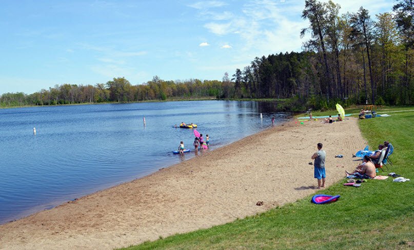Governor Thompson State Park spans over 2,800 acres of scenic woodlands northwest of Crivitz in northeastern Wisconsin, along the Caldron Falls Flowage of the Peshtigo River with 6 miles of shoreline and smaller kettle lakes like Woods Lake featuring a 150-foot sandy beach. Established in 2000 and named for former Governor Tommy Thompson, it offers 16 miles of hiking trails past striking rock formations, non-motorized boating, fishing, picnicking, a family campground with 100 modern sites (some electric and boat-in), cross-country skiing, snowshoeing, and abundant wildlife including deer, grouse, and turkey.
