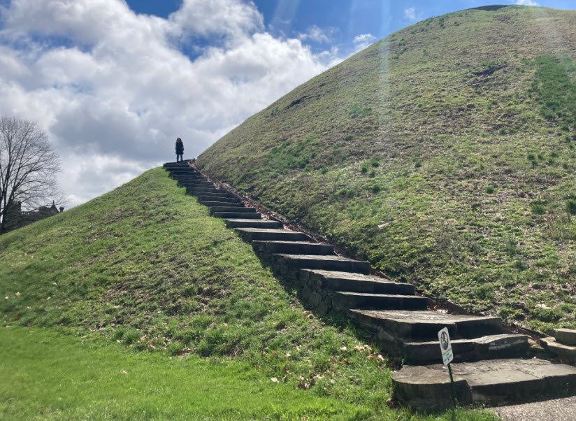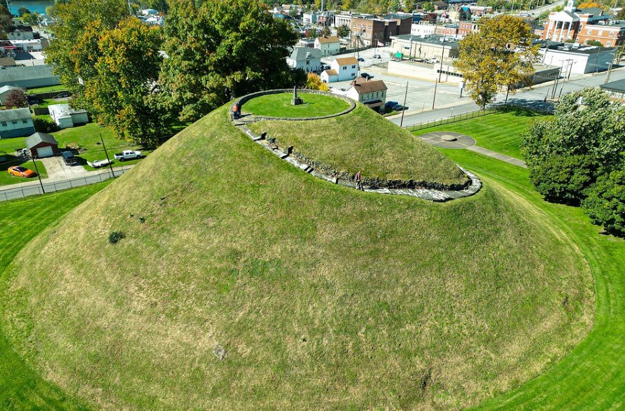 Grave Creek Mound Historical Site in Moundsville, West Virginia, is an ancient burial mound constructed by the Adena culture around 250 to 150 BC.
