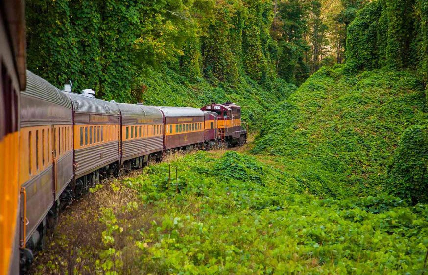 Great Smoky Mountains Railroad in Bryson City, North Carolina, offers scenic excursion trains along 53 miles of historic track through Nantahala National Forest, river gorges, tunnels, and trestles near Great Smoky Mountains National Park, with popular routes like the 4-hour Nantahala trip featuring a layover for riverside picnics.