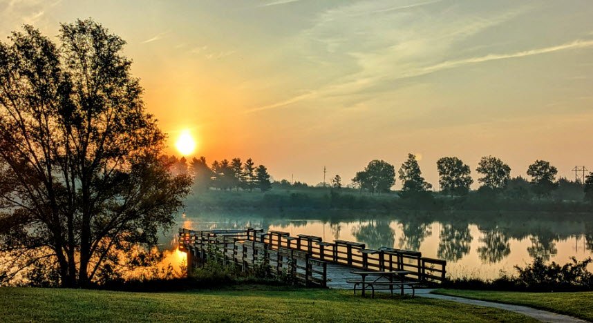 Nearly 10 miles of combined paved and soft trails wind through wetlands, woodlands, and prairie remnants for hiking, mountain biking, and wildlife viewing, complemented by a 101-site campground with showers, three cabins, picnic shelters, and a playground.