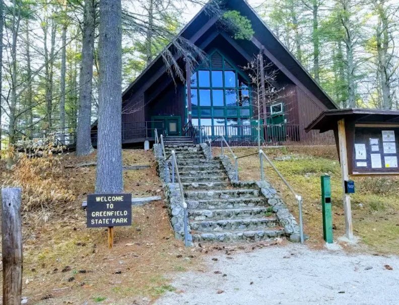 Greenfield State Park covers 400 acres in southwestern New Hampshire near Greenfield, featuring ponds, bogs, forests, and shoreline along undeveloped Otter Lake.
